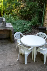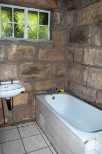 area, Bathroom with bath, shower & toilet, and an outside stoop.